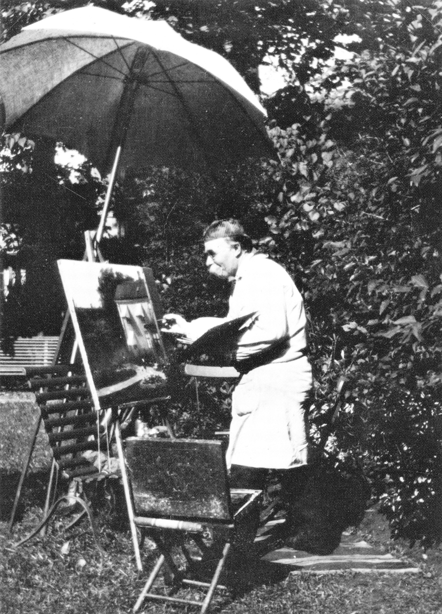 Severin Nilson målar av Augustinska fastigheten i Halmstad. Han står i en parkmiljö på en liten matta med färglådan på en pall, staffli och ett parasoll lutat mot en parksoffa.