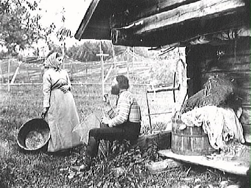 Fiskare med ryssja och kvinna med ett träkar i samspråk vid en timrad bod invid Knobesholmsjön. I bakgrunden hänger garn på tork och fler ligger i ett laggat kar under bodens utskjutande gavel.