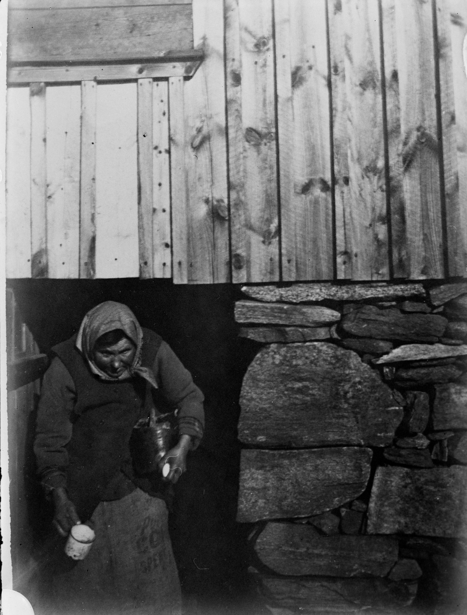 Fotografens mor "Kloar-Inger" på väg upp ur sin källare med ett lerkrus under armen, ett ägg i ena handen och en emaljmugg i andra. Kjorteln är troligen sydd av en säck då den har tryckt text på ena sidan.