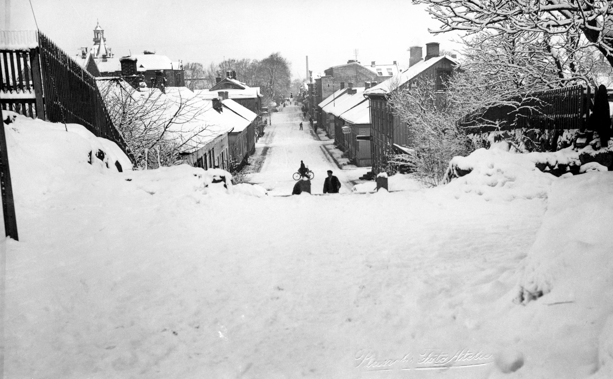Vinterbild med vy norrut från Kvarnberget ner längs Drottninggatan i Varberg.