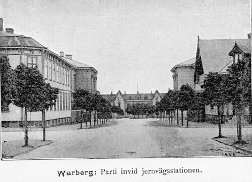 Vykort, "Warberg. Parti invid jernvägsstationen." Den avenyliknande (trädkantad och bredare än övriga gator) Eskilsgatan sedd mot järnvägsstationen i väster. Byggnaden till vänster närmast kameran kallas Adolfssonska fastigheten och ligger i kv Verkstaden; till höger kv Pipebruket.