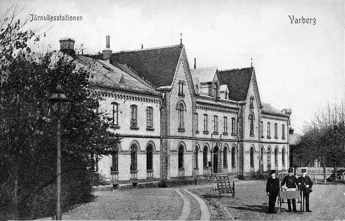 Vykort, "Järnvägsstationen Varberg". Nere till höger i bild står tre uniformerade ynglingar med en kärra, troligen stationspersonal. I bilden finns även ett par lastkärror.