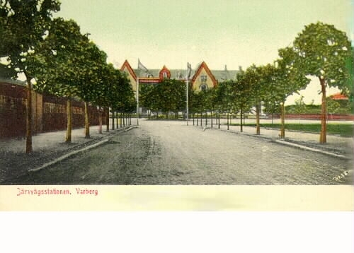Vykort, "Järnvägsstationen. Varberg." Bilden är tagen från Eskilsgatan mot stationshuset i väster. Gatan är utformad enligt dåtidens stadsideal som en aveny, dvs bredare än övriga gator, trädkantad och leder fram till ett speciellt mål - i detta fall stationen. Gatan mynnar i en rundel framför stationsentrén där resenärerna kunde stiga på och av sin skjuts.