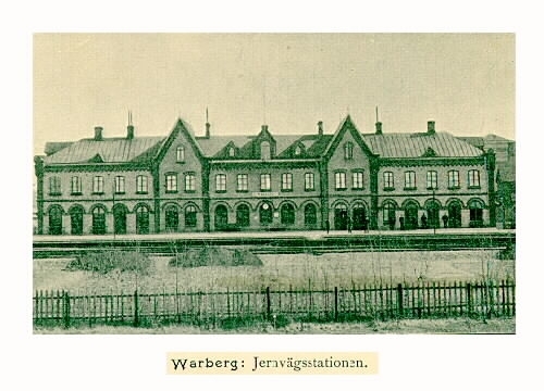 Varbergs järnvägsstation, fasaden mot väster åt spåren. Tillbyggnaderna på ömse sidor om den ursprungliga huskroppen tillkom år 1893.