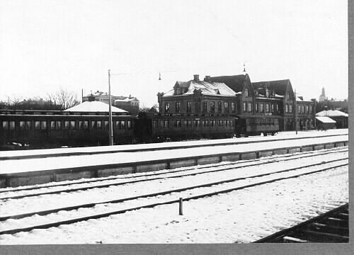 Varbergs järnvägsstation en vinterdag. Bilden tagen mot sydost från spårsidan. Ett tåg står inne.