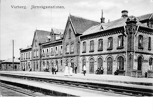 Vykort, "Varberg. Järnvägsstationen." Bilden är tagen från spårsidan mot nordost. Ett par vitklädda kvinnor går längs perrongen, där fler resenärer och stationspersonal befinner sig.