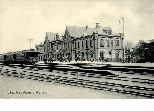 Vykort, "Järnvägsstationen, Warberg." Bilden är tagen från spårsidan mot nordost. Ett tåg står inne och på perrongen befinner sig resenärer och andra.