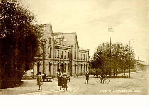 Vykort, "Varberg. Järnvägsstationen". Stationen ligger utmed Västra Vallgatan, som här vidgas till en stationsplan med trädprydd rundel för skjutsarna. Bilden är tagen mot norr.