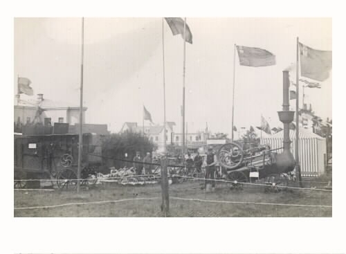 Hantverks- och industriutställningen i Varberg 1904. Tröskverk och ångmaskin uppställda på kvarteret Malmen. Bilden tagen mot väster. Till höger i bild syns det ena av "Tvillinghusen" och i mitten syns stationsbyggnaden.
