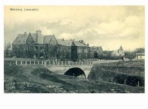 Vykort, "Warberg. Lasarettet." Gamla lasarettet låg vid en av järnvägsbroarna som tillkom då järnvägens sträckning söderut 1920 drogs genom berget mellan Platsarna och staden.