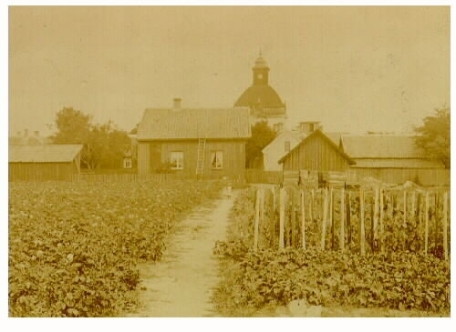 Bostadshuset i mitten låg på Gröna gatan 11 i Falkenberg, sedermera fattighus (1873-93), och revs 1916. Grönsaksodling i förgrunden med störar för ärter eller bönor.
