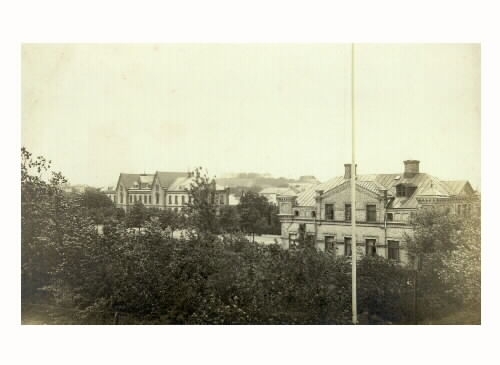 Till vänster syns Varbergs järnvägsstation och till höger den sk Uddenbergska villan vid Magasinsgatan, som uppfördes under 1880-talet till järnvägschefen för Varberg-Borås järnväg.