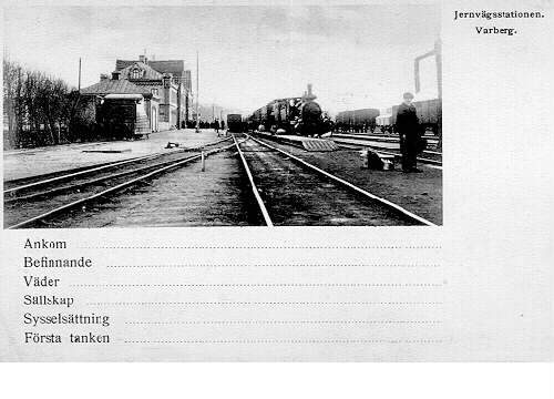Brevkort, "Jernvägsstationen. Varberg." Rubriken "Första tanken" säger en del om vikten av första intrycket av staden var när resenären klev av tåget. Varje ort la också manken till för att göra just första anblicken av stationsområdet och samhället så attraktiv som möjligt. Järnvägsstationen ses från norr. På perrongen står en folksamling, ett tåg är på väg norrut och närmast i bild befinner sig en person mellan spåren.