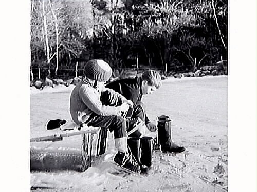 Skridskoåkning på dammen "Dammet"n i Ölmevalla. Pojkarna heter Thomas och Ingemar, som sitter närmast kameran.