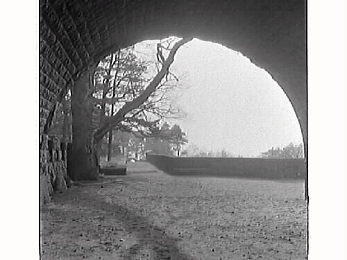 Vy mot havet genom valvet på Tjolöholms slotts östra sida. Man ser muren som hägnar trädgården åt havet.