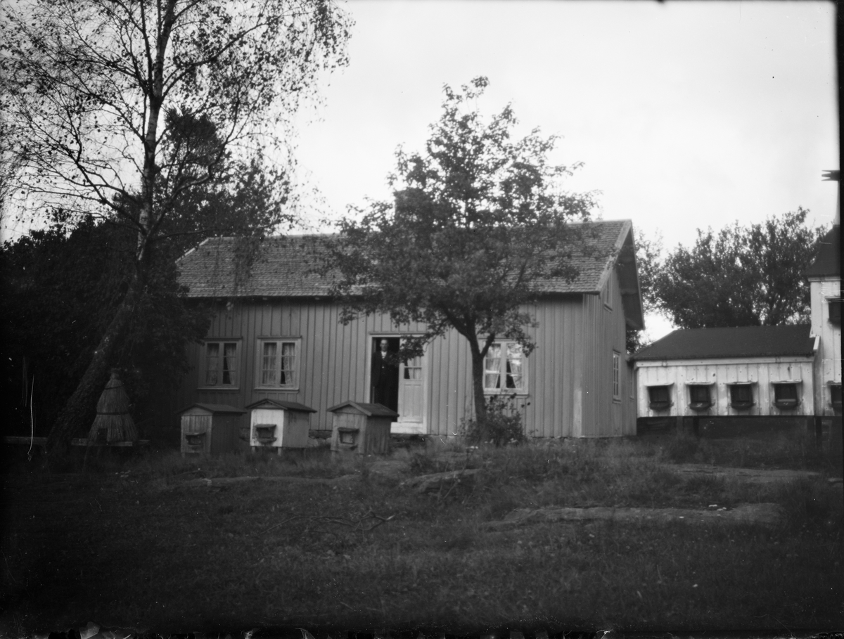 En man står i dörröppningen till sitt bostadshus. Framför stugan står tre bihus och en bikupa av halm. I bakgrunden en särpräglad byggnad med ett lågt torn, prytt med en vimpel; troligen ett duvslag.