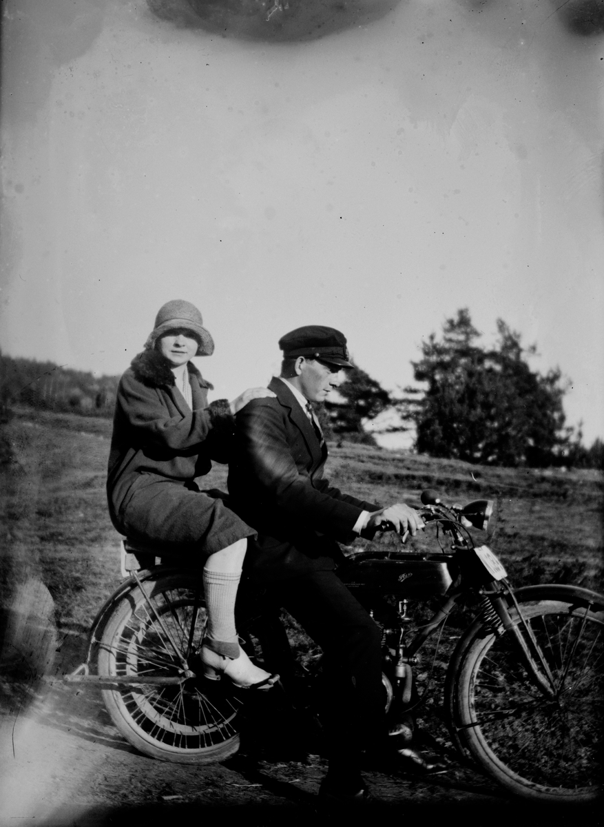 "Kålhage-Emilia åker motorcykel". Emilia sitter på pakethållaren i pälsbrämad kappa, klockad hatt och knästrumor. Föraren har skärmmössa.