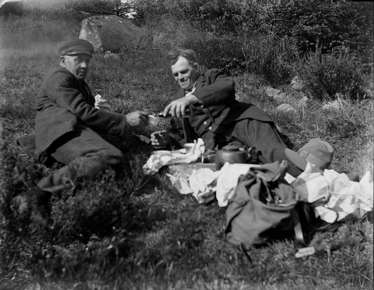 Ett par herrar ligger i en gräsbacke och dricker kaffegök, med kaffepannan mellan sig. Den ene heter Johannes Lundgren.