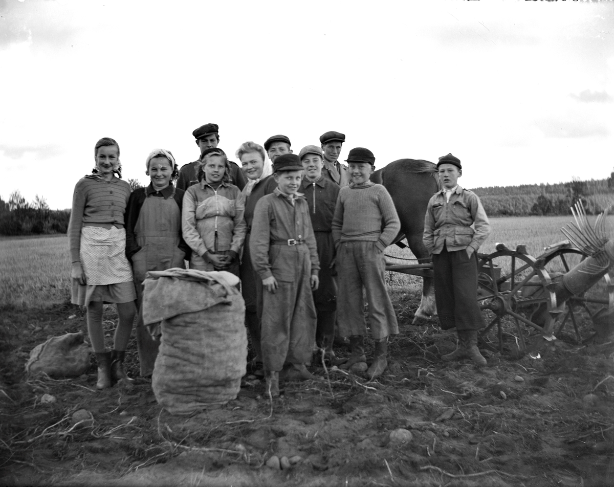 Paus för fotografering i potatisskördandet på Järlövs gård med hästdragen potatisplockare bakom folket och en välfylld potatissäck framför dem.