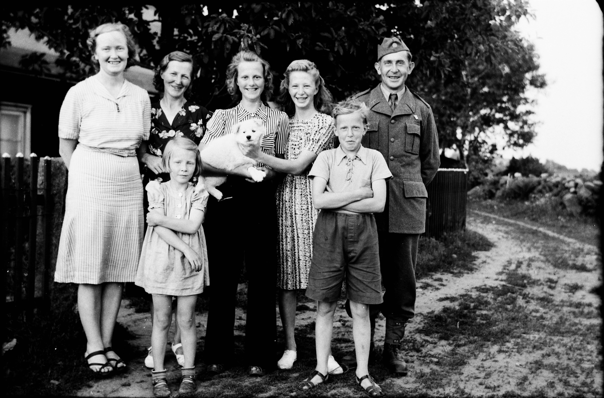 En man i uniform står tillsammans med fyra kvinnor, två barn och en vit hundvalp vid staketet till en trädgård.