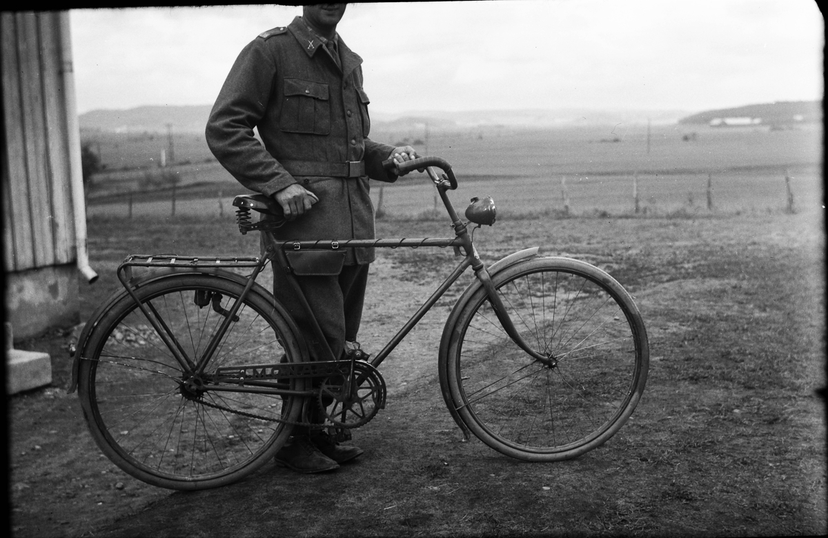 En militär stöttar en Monarkcykel för fotograferingen.