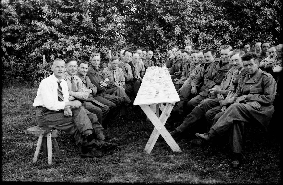 Kaffekalas vid långbord under beredskapen vid andra världskriget, sannolikt i Grimeton. Somliga bär uniform medan andra sitter i bara skjortärmarna.
