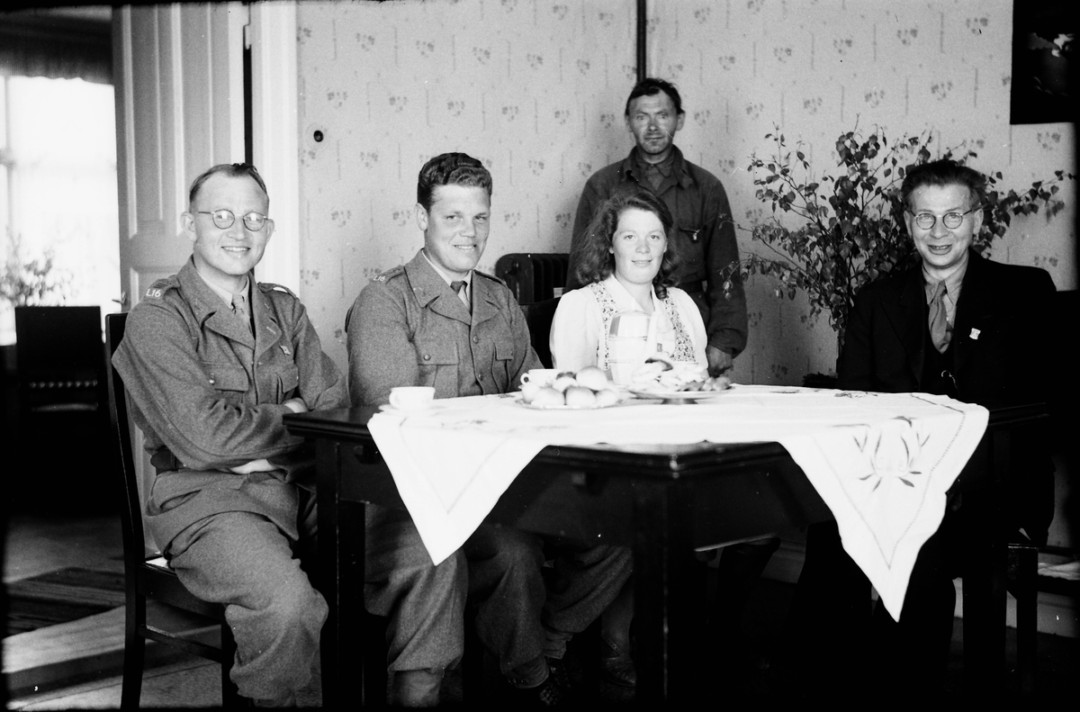 Fotografen "Kloar-Erik" står själv i hörnet bakom ett sällskap vid kaffebordet i en finare sal med pardörrar och högt till tak. Två av männen bär uniform (märkta L16 på axelklaffarna). På bordet med broderad duk är bullar och kakor framdukade och en vas med björkris står vid sidan av.