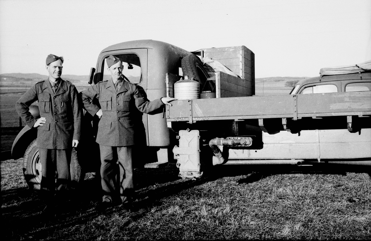 Två beredskapsmän vid en gengasdriven lastbil med flak och ett annat fordon skymtande i bakgrunden.