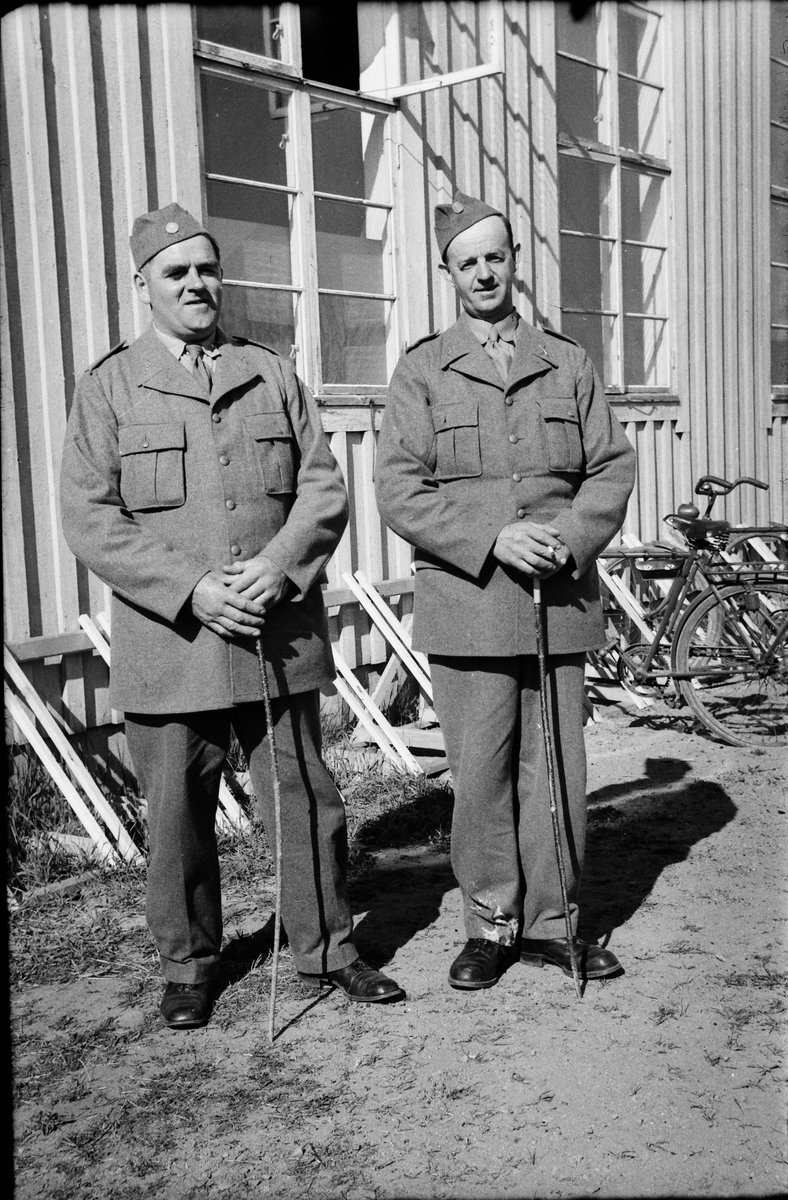 Ett par beredskapsmän står invid en byggnad med stora fönster, enligt uppgift en bygdegård i Grimeton. I bakgrunden en hop med cyklar. Båda männen stödjer händerna på käppar och den ene har en cigarett.