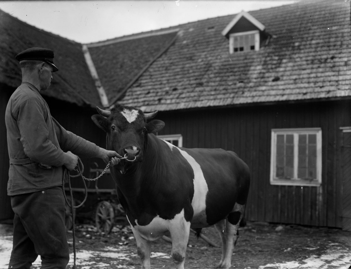 Drängen på Kalvhult håller en tjur med nosring. De står på gårdsplan och i ladans hörn skymtar en hästvagn.