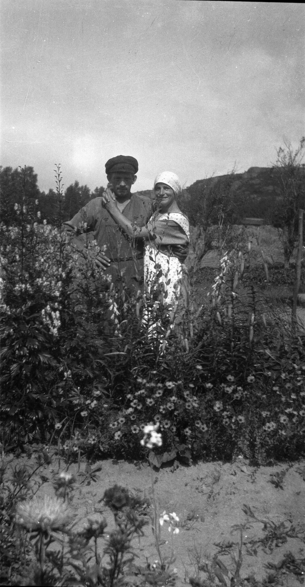 "Kålhage-Karl" med en kvinna vid sin sida bakom en ymnig blomsterrabatt med bland annat stormhattar, liljor och borstnejlikor.