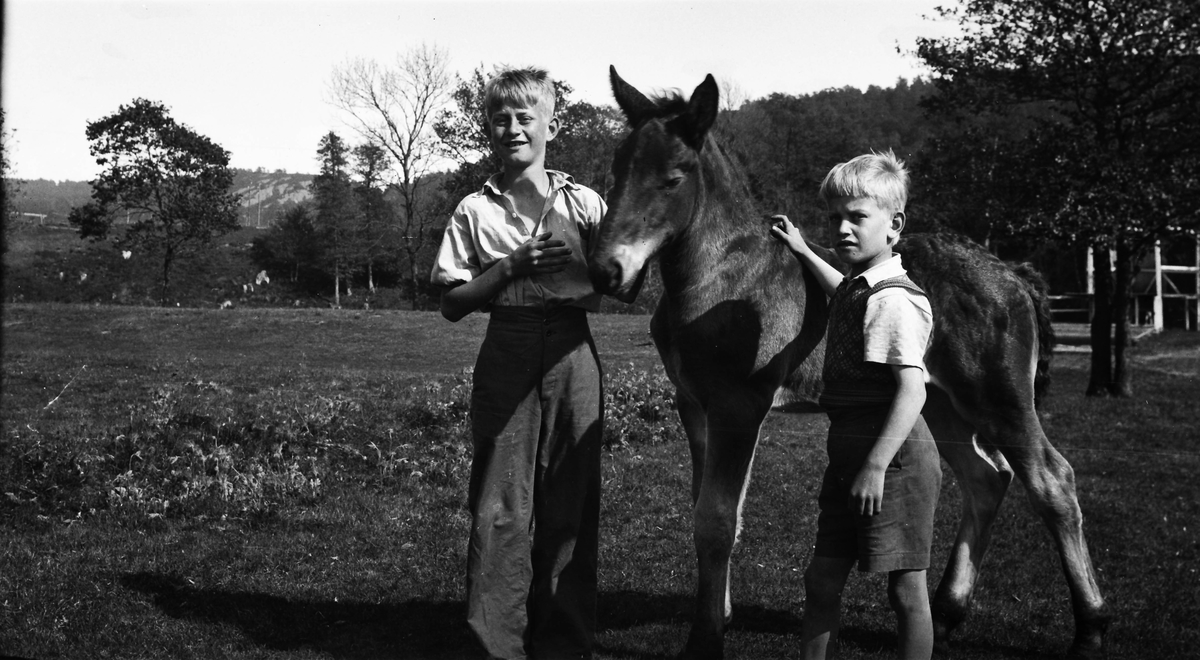 Två pojkar från Höga (Höwa) står utomhus med ett föl. Den äldre till vänster heter Tage Andersson och den mindre Lars.