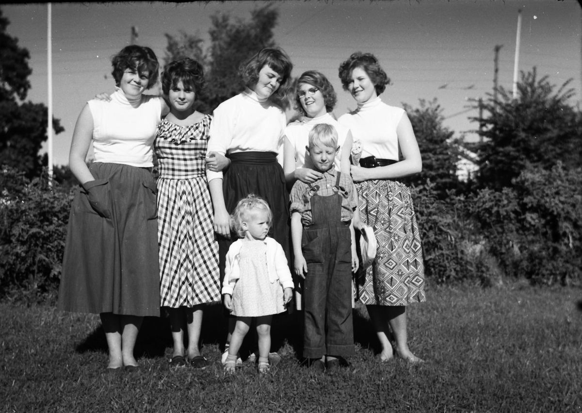 Fem tonårsflickor står sommarklädda men två mindre barn framför sig. Fr. v (ordningen inte helt säker): Ann-Margret Brinktell, Lissie Karlsson, Marianne Brinktell, Gunilla Johansson, Inga-Lena Johnsson. Ett av barnen kan vara Elis Brinktell.