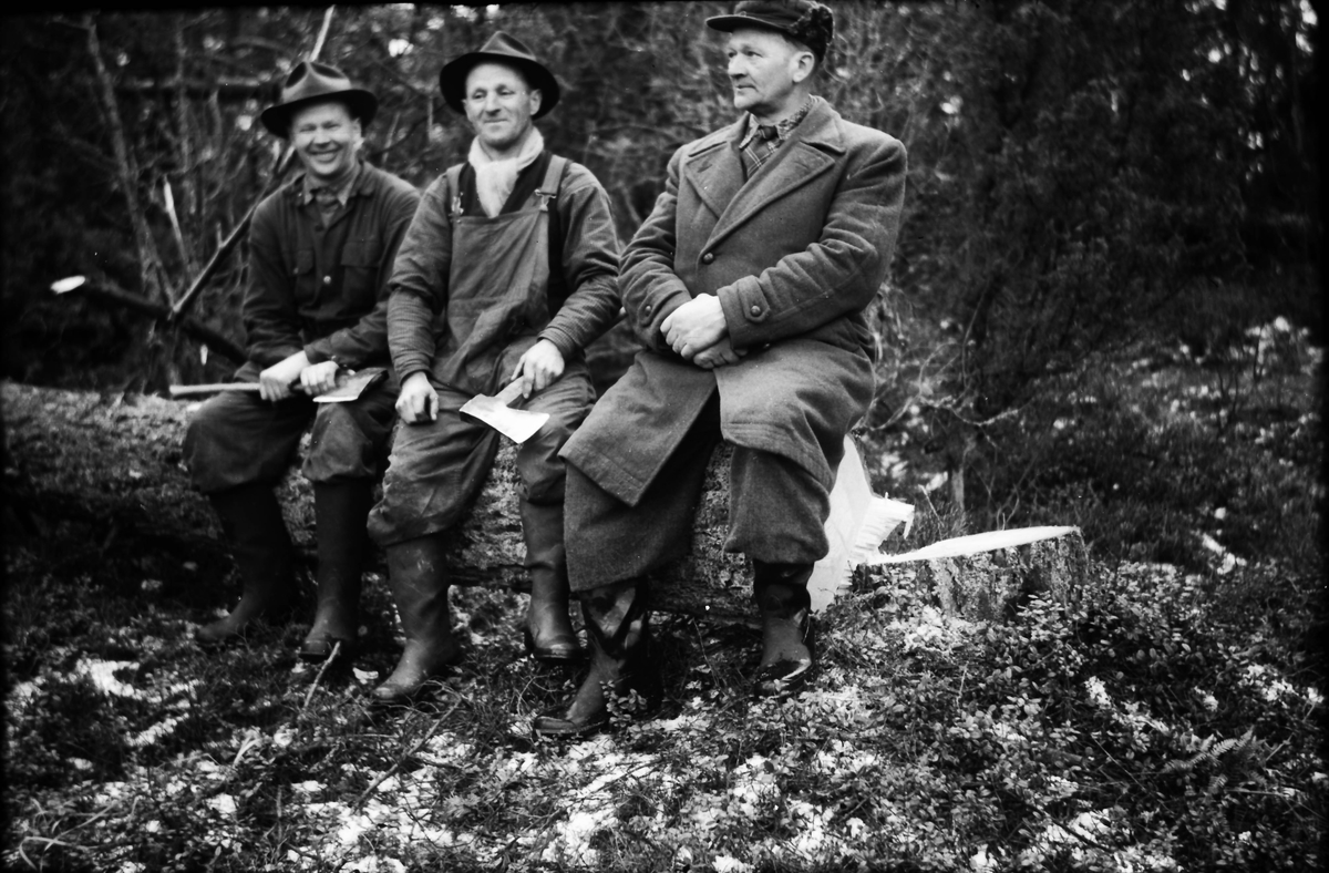 Tre skogsarbetare sitter på en nyfälld stock: Viktor i Storåker i mitten med John "på Centralen" Johnsson till höger och hans bror Erik till vänster. Viktor och Erik håller i varsin yxa.