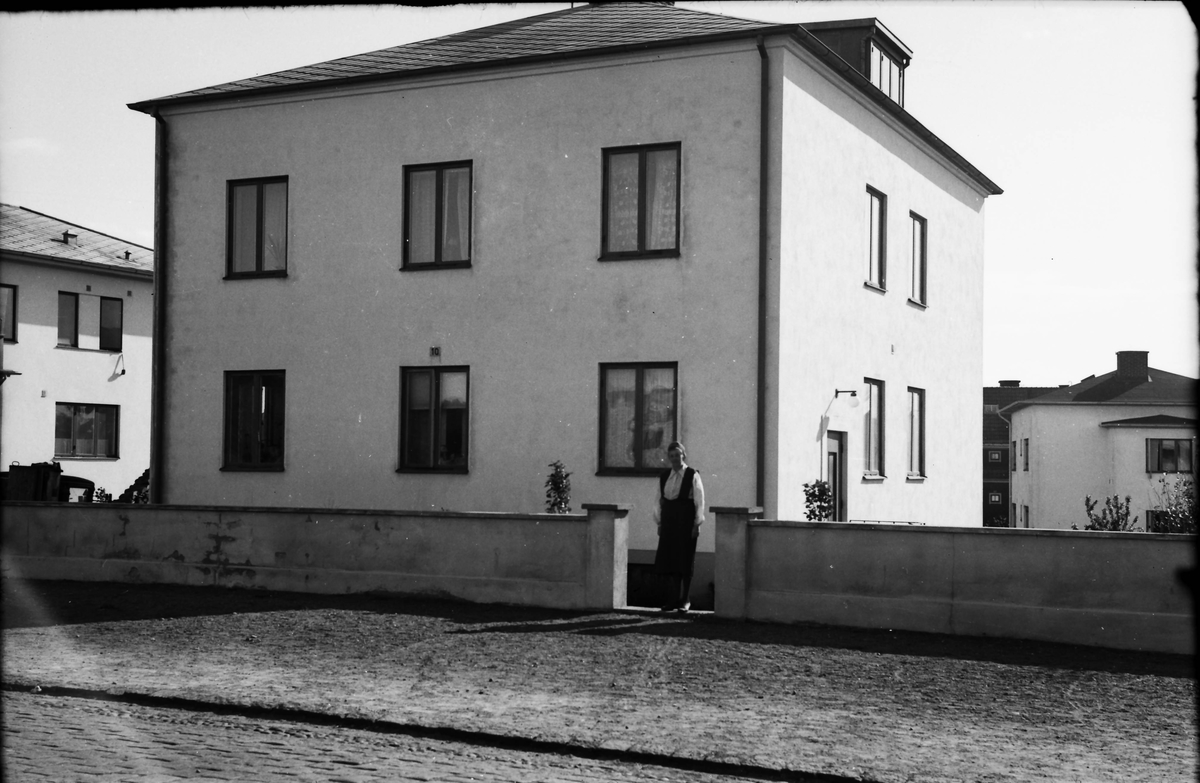 En kvinna står i muröppningen in till ett tvåvånings funkishus med pyramidtak. Runt om syns liknande bostadshus, eventuellt i Varberg.