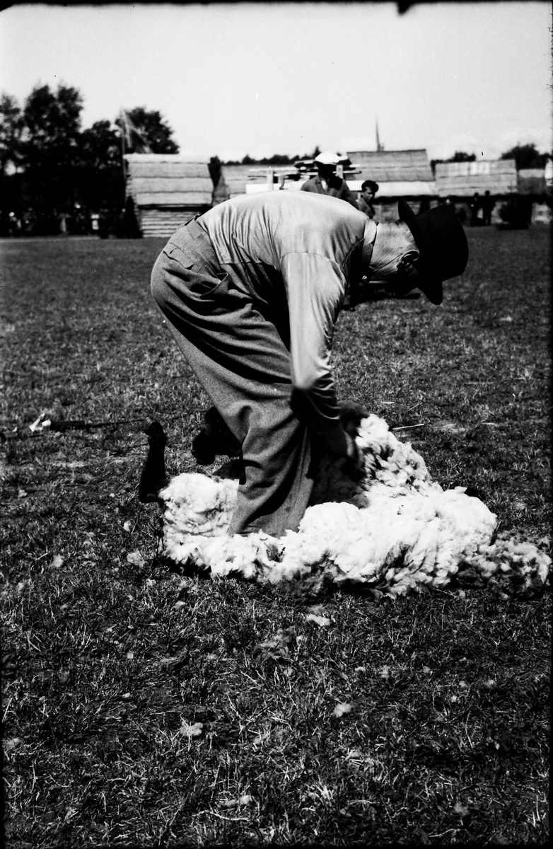 Fårklippning. En man står böjd över fåret och klipper det på ett fält med bodar, flaggor och folk i bakgrunden.