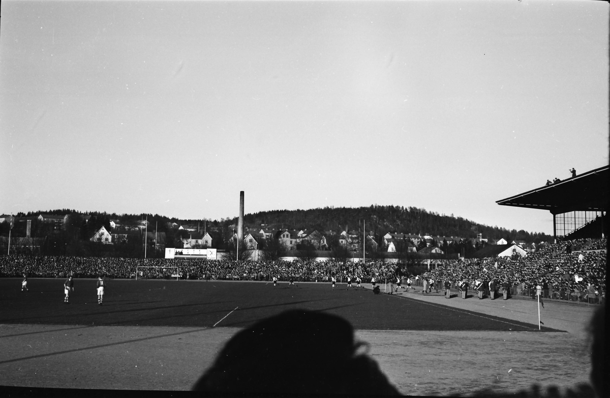Fotbollsmatch på Ryavallen i Borås. Ena laget springer in på planen framför en fotograf och på läktartaket står ännu en man med kamera. Nedanför läktaren står några batterister med ryggen åt kameran.