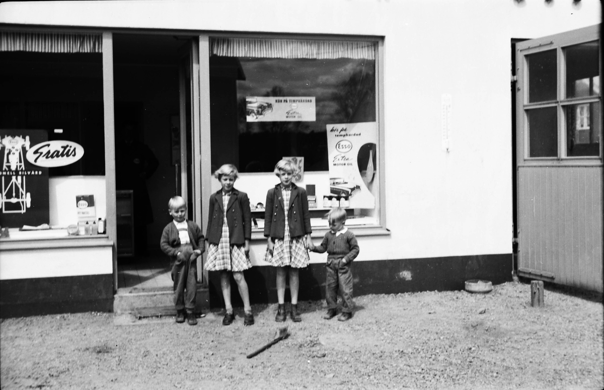 Ett par tvillingflickor står med pojkarna Kennet och Tommy Svensson framför skyltfönstren till Esso i Veddige.