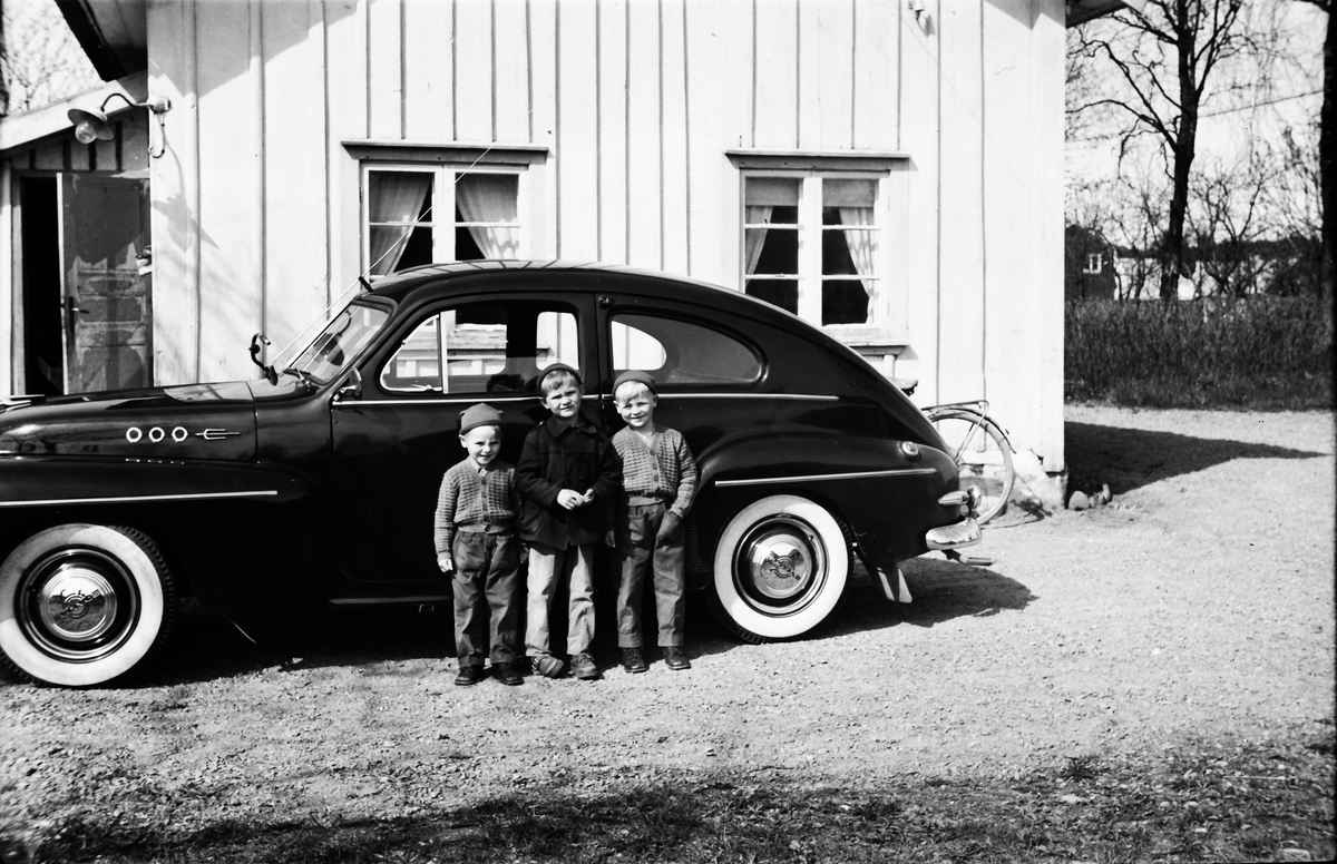 Tre pojkar står vid en Volvo PV, parkerad invid en husgavel. Pojken i mitten är på besök hos bröderna Tommy och Kennet Svensson, som är likadant klädda.