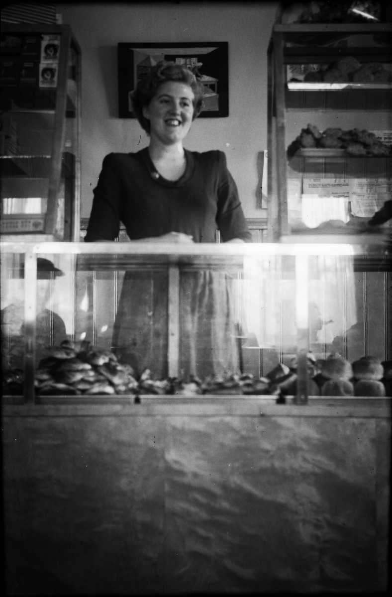 Expedit en Vivvi Carlsson bakom disken på Carlssons Café i Veddige. I disken ligger vetebröd av olika sorter.