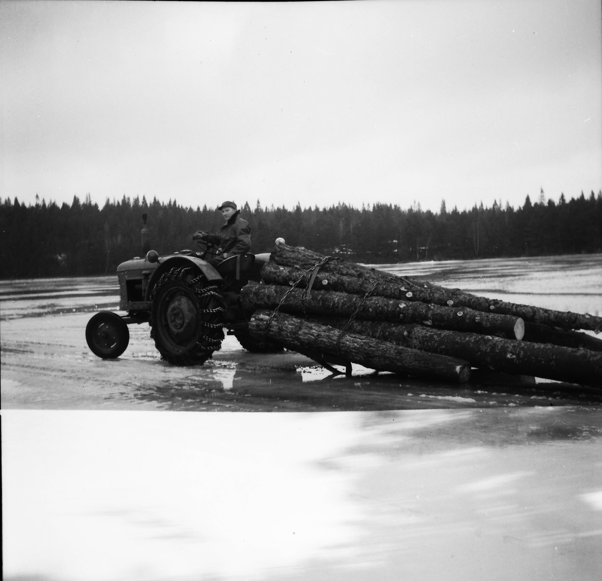Traktor med timmerlass på isen över Ärsjöarna vid Kantabur västerskog. Mannen på traktorn är Ivar Karlsson i Vagnabäck.
