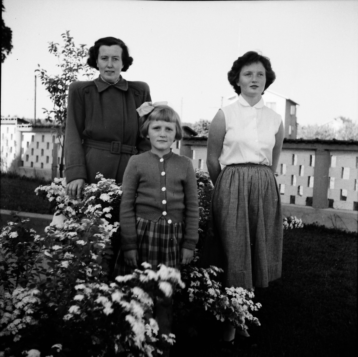 "Murar-Albins" familj i trädgården vid huset i Lortabäck: frun Alma Johansson med den yngre dottern Majvi och den äldre Inga-Britt. De står vid en spireabuske i blom och bakom dem ser man den särpräglade mur som omger murarens tomt.