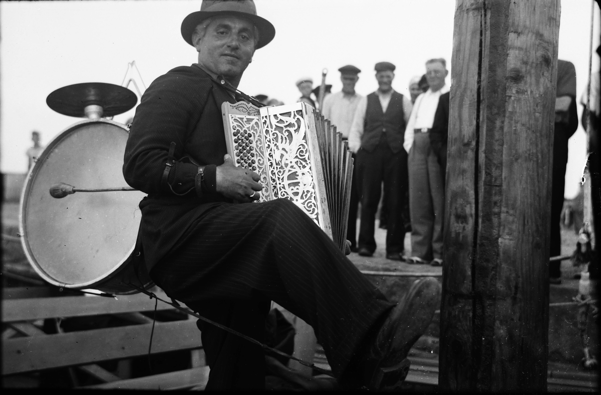Enmansband - dragspelare med trumma på ryggen. I bakgrunden står en manlig publik och lyssnar.
