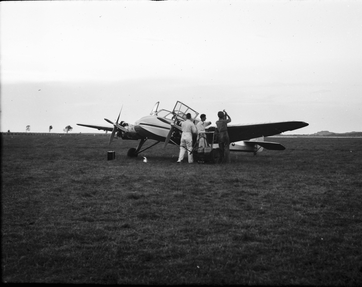 Ett litet propellerflygplan står på ett vidsträckt gräsfält och tre män i overaller arbetar vid dess ena vinge. En vagn med två slangförsedda behållare står intill dem och under den andra vingen står en box.