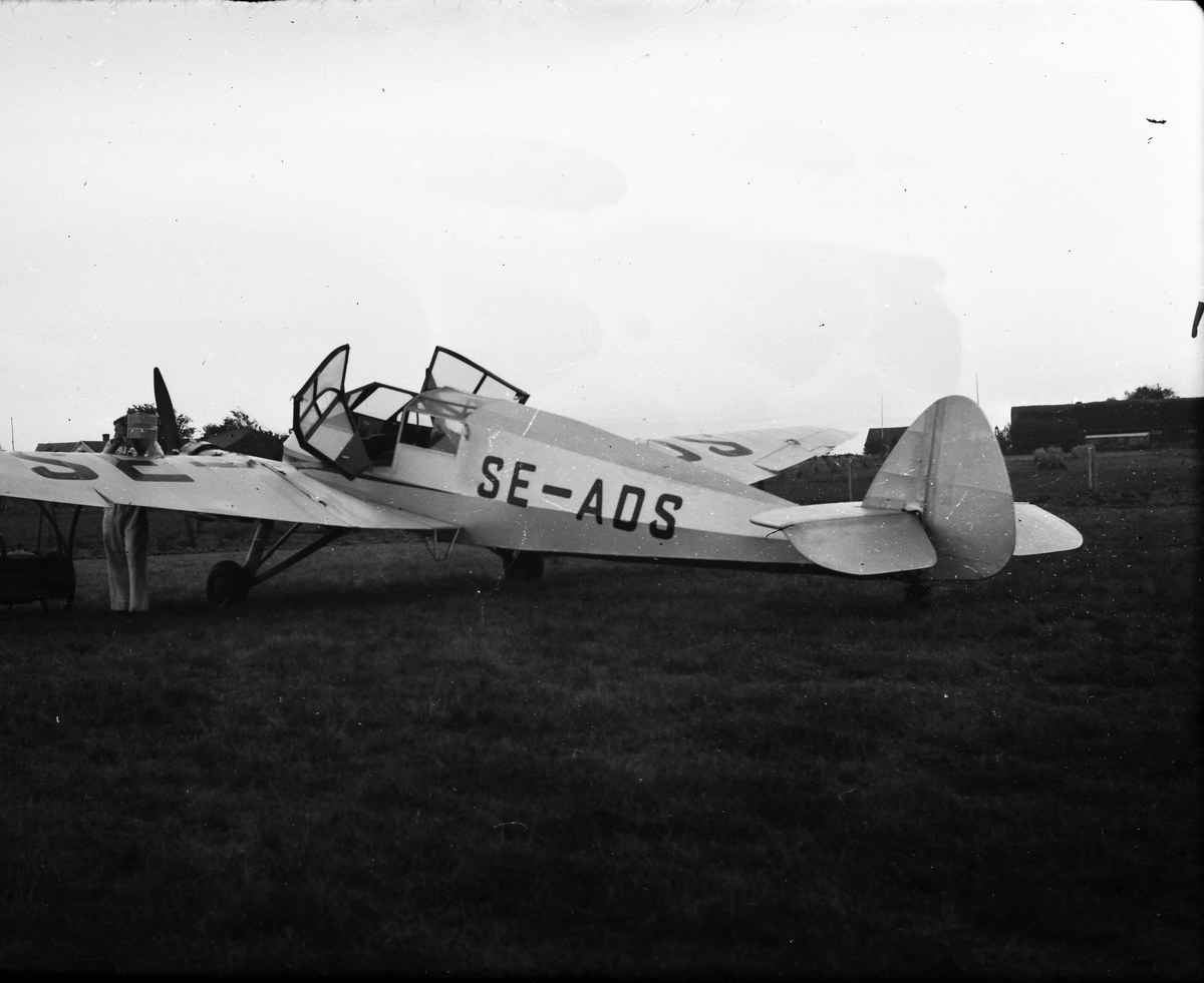 Ett litet propellerflygplan sett bakifrån står på ett gräsfält (Getterön?) och en man i overall förefaller tanka planet via vingen. En vagn med två slangförsedda behållare står bakom vingen.