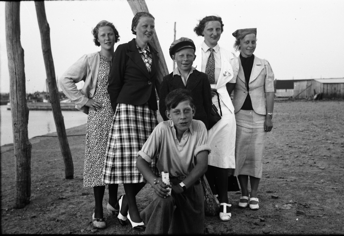 En grupp finklädda ungdomar på utflykt. Här står de på kajen i Varberg, men på bildnr EA1068 sitter de i en båt vid denna kaj. Pojken på knä håller i något som kan vara en godispåse. Flickorna har lätt puffärmade dräktjackor, klänningar, någon sorts huvudbonad, strumpor och skor med klack. En av dem har ett ankare på kavajslaget.