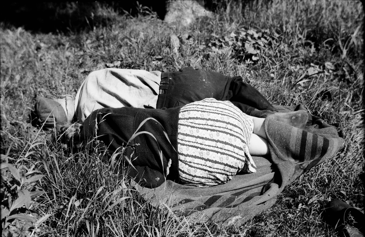 Ett par vilar i gräset på en filt. Det tycks vara lite kyligt för kvinnan har vikt upp filten över vaderna.