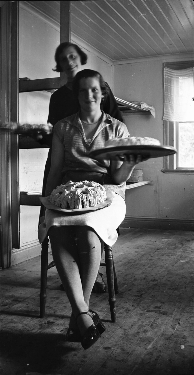 En ung kvinna sitter på en stol i ett kalt utrymme med en tårta i knät och en i handen. Bakom henne står en annan kvinna och håller ett fat med andra bakverk. Bilden kan vara från ålderdomshemmet i Thårstorp.