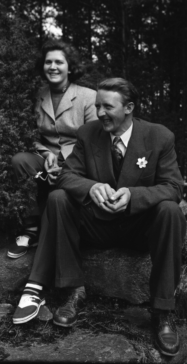 Syskonen Margit och Ivar Johansson från Sandlid sitter på en sten vid en en i skogen med var sin pingstlilja; Ivar bär sin på kavajslaget och Margit håller sin i händerna. Hon har tygskor och randiga strumpor, byxor, kort kavaj samt en stickad tröja med brosch på kragen.