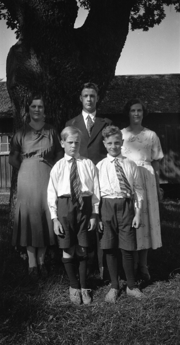 Syskonen Vidar, Einar (främst), Evert, Anna och Jenny Klasson i Albäck. De poserar finklädda vid en gammal ek och i bakgrunden syns en ekonomibyggnad med sticktak (pärt). Småpojkarna har kortbyxor, skjorta och slips.